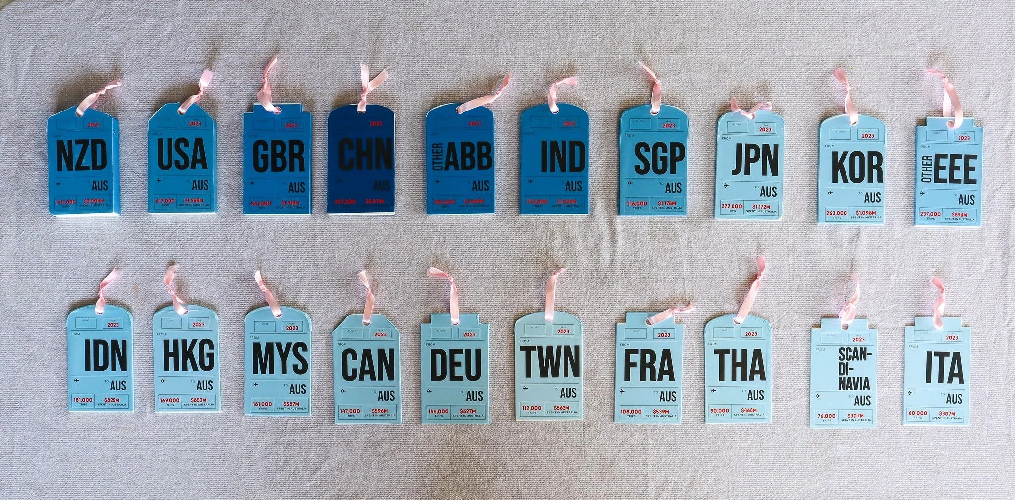 Each tag varying in thickness, shape, and color to represent distinct aspects: the number of trips departed from each country, the country region, and the total spending in Australia.